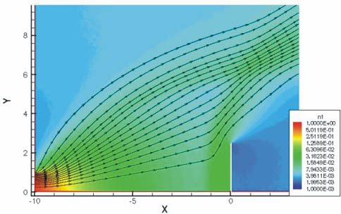 Взаимодействие струи гелия с диском. Плотность и линии тока. Число Маха М = 5. Число Кнудсена Kn = 0,01. Расчет методом Монте–Карло. |