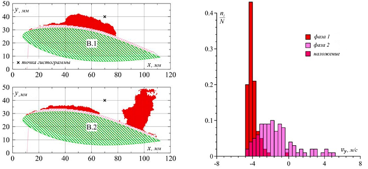 в виде мгновенных полей паровой фазы и гистограммы вертикальной скорости в точке (70; 40), обозначенной крестом.