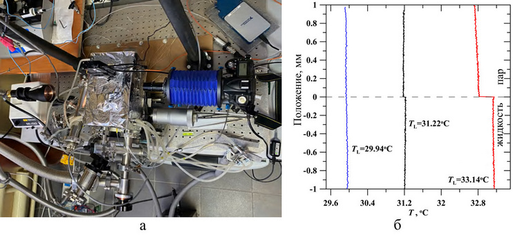 Фотография экспериментальной установки (а). Измеренные профили и скачки температур вблизи межфазной границы вода-водяной пар (б) при Tv = 29.9 °C [pv = psat(Tv) = 4222.9 Па]