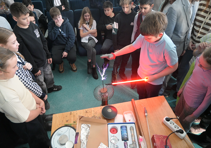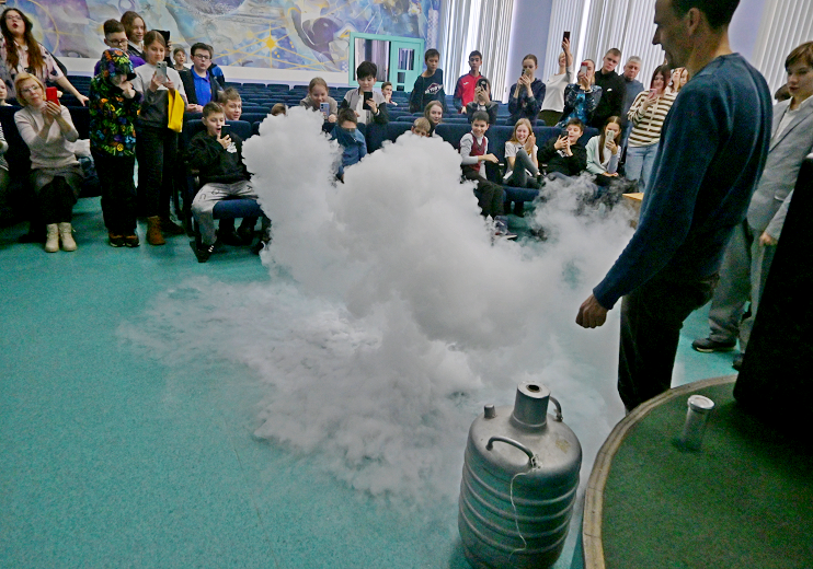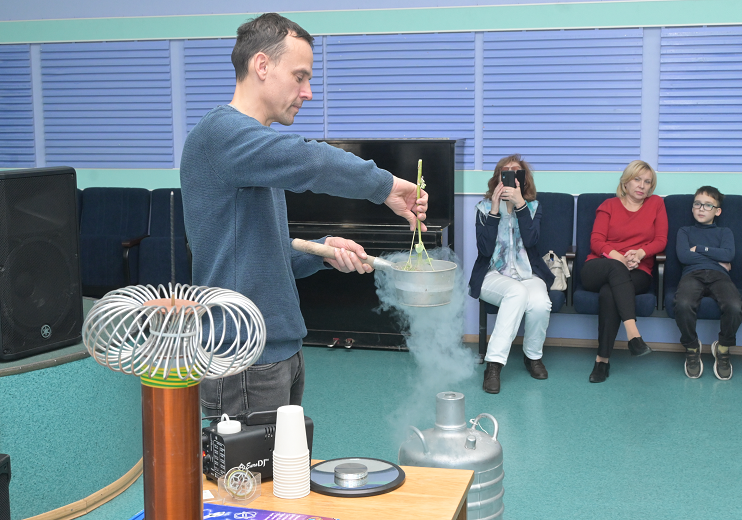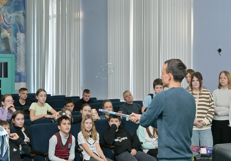 Физические опыты школьникам Центра образования и творчества «Созвездие» Наукограда Кольцово, Гимназии № 6 «Горностай» и Искитимской средней школы № 9 показывал заведующий