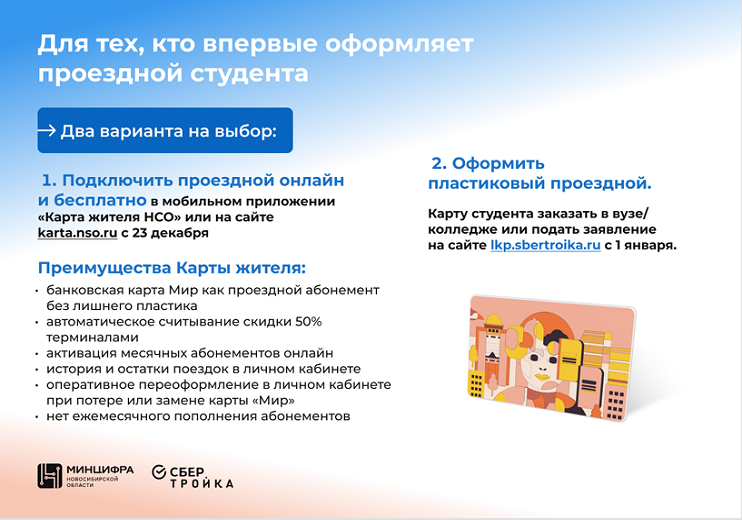 С 2025 года в транспортном сервисе Карты жителя Новосибирской области доступен студенческий проездной. Подключить его можно онлайн к любой банковской карте платежной системы «Мир» в мобильном приложении «Карта жителя НСО» или на сайте. Для оформления потребуется подтвержденная учетная запись на портале госуслуг.