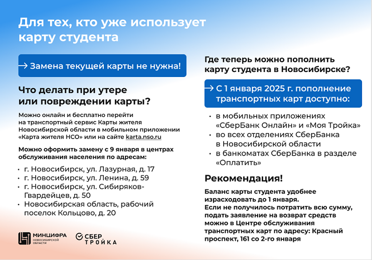 Прежняя пластиковая карта студента остается действительной, однако в связи со сменой операторов был изменен привязанный к ней счет. Если израсходовать баланс в 2024 году не получилось, можно обратиться с заявлением на возврат средств в МУП «Пассажиртрансснаб» по адресу: г. Новосибирск, ул. Красный проспект, 161.