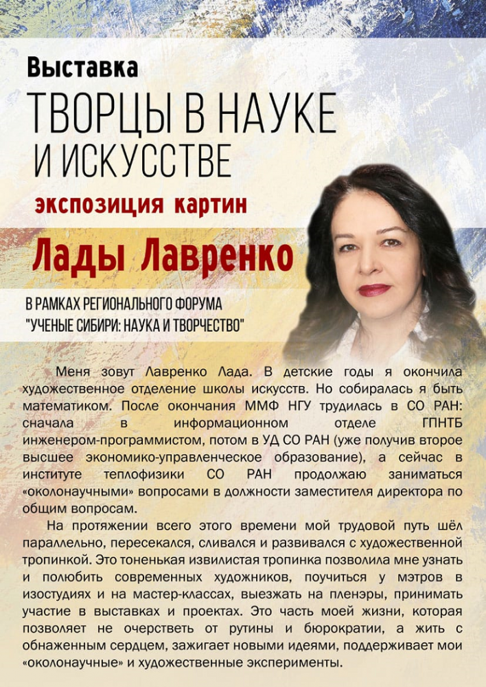 В рамках регионального форума «Ученые Сибири: наука и творчество» Выставочный центр СО РАН приглашает 24 ноября на открытие выставки "Творцы в науке и искусстве", где будут представлены экспозиции картин сотрудников научно-исследовательских институтов СО РАН, в том числе заместителя директора по общим вопросам Лавренко Лады Владимировны