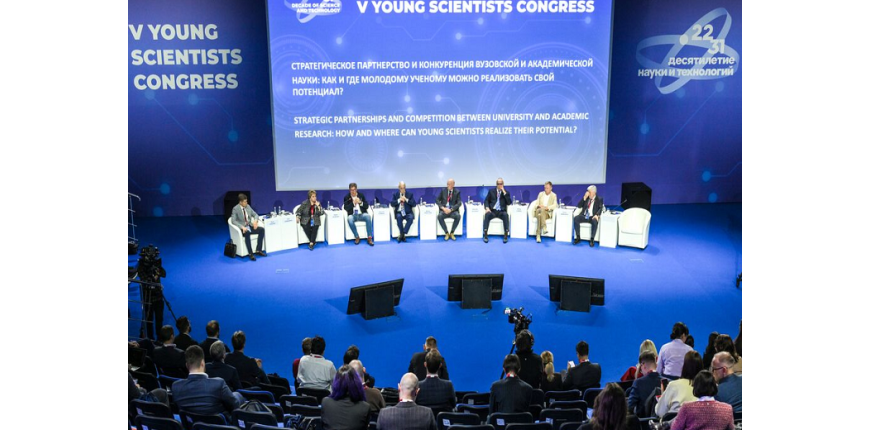 На V Конгрессе молодых ученых в рамках обсуждения вопроса «Стратегическое партнерство и конкуренция вузовской и академической науки: как и где молодому ученому можно реализовать свой потенциал?» заместитель председателя СО РАН, директор академик РАН рассказал о подходе, реализованном в Сибири.