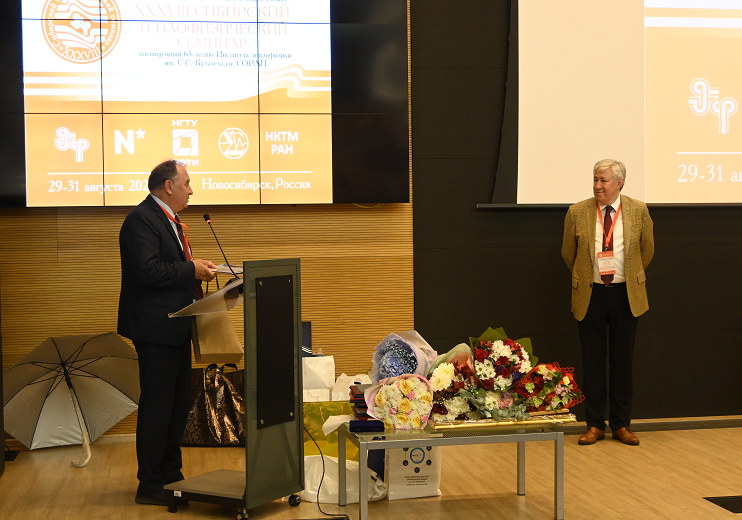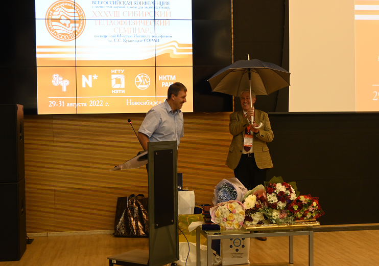 Заместитель директора по научной работе ИНГГ СО РАН, кандидат физико-математических наук поздравил с юилеем, поблагодарил научного руководителя ИТ СО РАН, академика РАН Алексеенко Сергея Владимировича за участие в экспедиции на Камчатку в июне 2022 года, подарил на юбилей памятную картину камчатского вулкана и выразил надежду на дальнейшее сотрудничество с Институтом теплофизики по геотермальной энергетике.