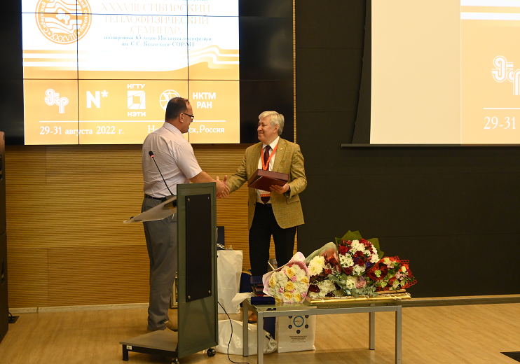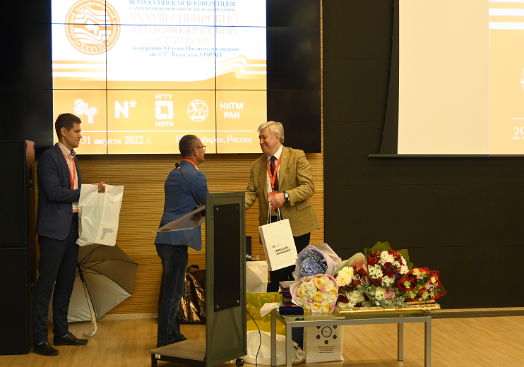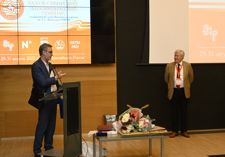 Заведующий кафедрой теплофизики СФУ г. Красноярск, доцент, кандидат технических наук Дегтерев Александр Анатольевич поздравил Институт с юбилеем от имени руководителей СФУ и лично от себя, как руководителя Красноярского филиала Института теплофизики им. С.С. Кутателадзе СО РАН.