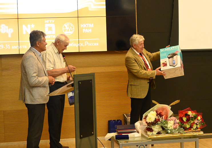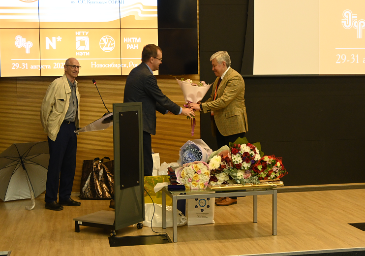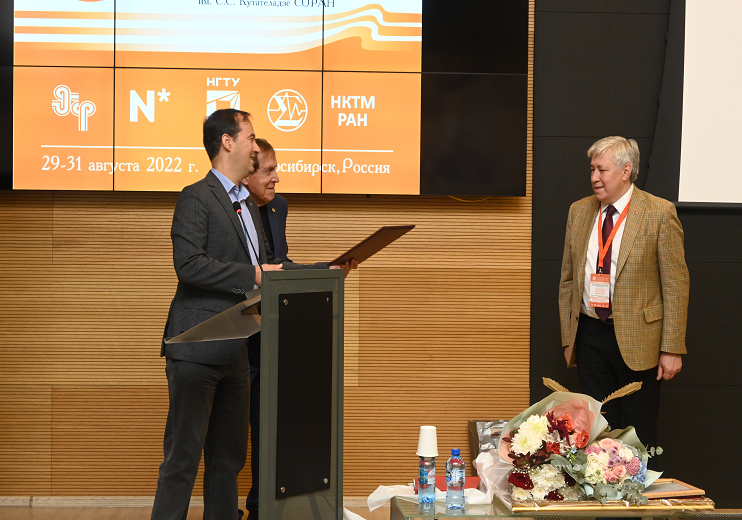 Врио директора ИТПМ им. С.А. Христиановича СО РАН, зам. директора по научной работе, доктор физико-математических наук и заместитель директора по научной работе, кандидат физико-математических наук поблагодарили Институт теплофизики за многолетнее плодотворное сотрудничество и вручили памятный подарок.