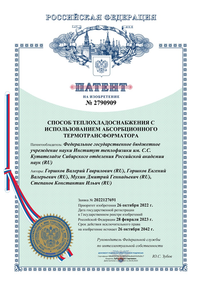 28 февраля 2023 г. в Государственном реестре изобретений зарегистрировано изобретение "Способ теплохладоснабжения с использованием абсорбционного термотрансформатора"