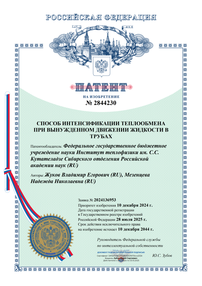 28 июля 2025 г. в Государственном реестре изобретений зарегистрировано изобретение "Способ интенсификации теплообмена при вынужденном движении жидкости в трубах"