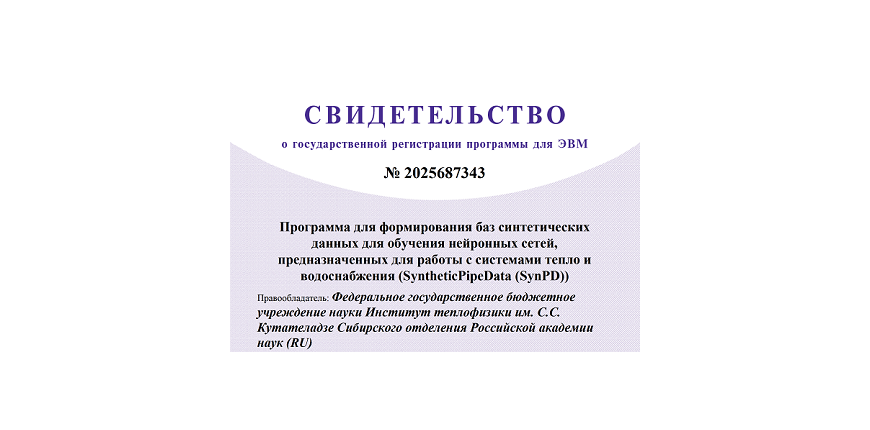 9 октября 2025 г. в Реестре программ для ЭВМ зарегистрирована "Программа для формирования баз синтетических данных для обучения нейронных сетей, предназначенных для работы с системами тепло и водоснабжения (SyntheticPipeData (SynPD))"