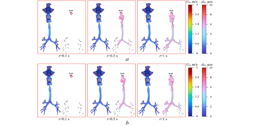 Разработку модели распределения лекарственного аэрозоля в дыхательных путях с учетом температуры тела и анатомии пациента выполнили ученые Томского политехнического университета в составе научной коллаборации. Модель позволяет прогнозировать, как аэрозоль распространяется от полости рта до бронхов третьего порядка при разных условиях — скорости вдоха, температуре воздуха и особенностях дыхательной системы.
