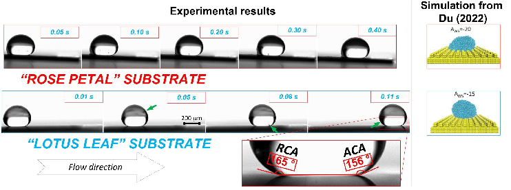 При моделировании был обнаружен режим течения капли воды по поверхности, при котором оттекающий краевой угол смачивания больше, чем натекающий, что ранее считалось невозможным. Авторам статьи удалось создать материал с соответствующими характеристиками и показать, что такие режимы течения действительно реализуются. Это открывает возможность разрабатывать новые подходы для управления контактом жидкости с твердой стенкой.